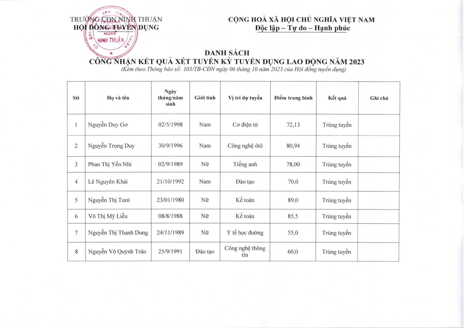 THÔNG BÁO KẾT QUẢ TRÚNG TUYỂN KỲ TUYỂN DỤNG LAO ĐỘNG NĂM 2023 CỦA TRƯỜNG CAO ĐẲNG NGHỀ NINH THUẬN